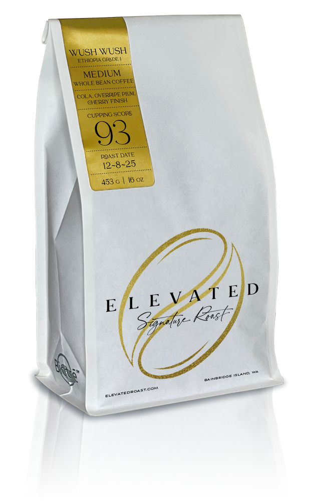 Let’s begin by saying Wush Wush is unlike any coffee we’ve tasted. In the past 5-7 years it has ranked from No. 3 to No. 14 in the world’s best-rated cuppings. An Ethiopian Grade 1, grown at more than 7,500 feet, It has scored impressively from 96 to 92 points. Compared to the floral, tea-like Geisha’s at $65 per bag, Wush Wush is palate-twisting and evolving cup as it cools. A 96-hour anaerobic fermentation takes this wild and heirloom plant to a level of complexity rarely found in coffee. The light roast is not for everyone — piquant with a sour-cherry finish — medium roast was loaded with Cola and rich, red plum that was overdue.